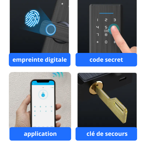 Le système permet plusieurs méthodes d’accès : empreinte digitale, code numérique et application mobile. La serrure fonctionne sur alimentation par batterie et dispose d’un mode d’ouverture mécanique de secours.